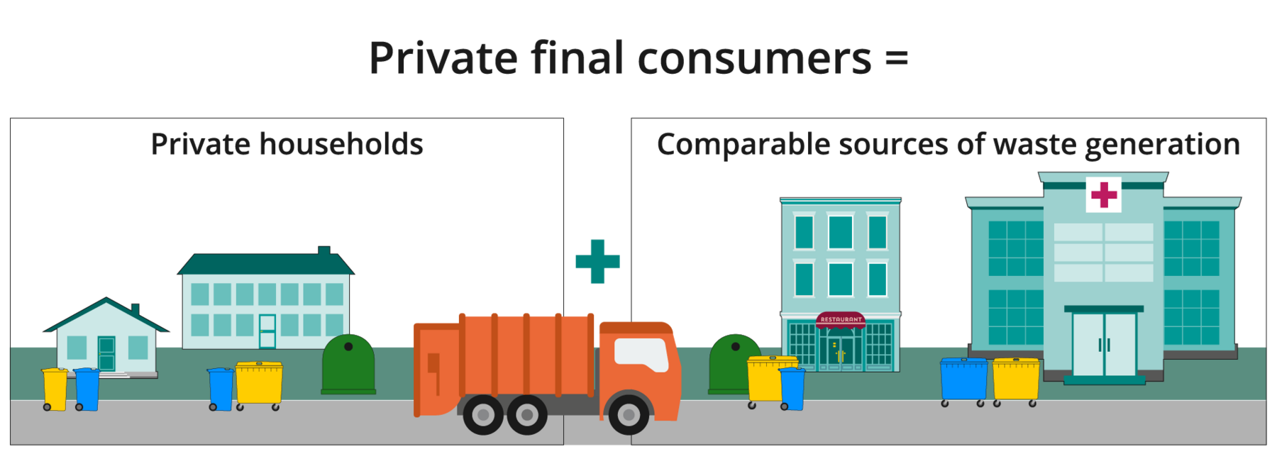 The Verpackungsgesetz (Packaging Act) defines private final consumers as private households and comparable sources of waste generation such as restaurants, hotels, hospitals, canteens, amusement parks, garden centres, laundries, libraries and schools. Comparable sources of waste generation also include craft enterprises and agricultural holdings where packaging waste is collected at the rate that is normally associated with private households, i.e. at 14-day intervals and in a waste bin that does not exceed 1,100 litres per collection group. A list of comparable sources of waste generation can be found here.