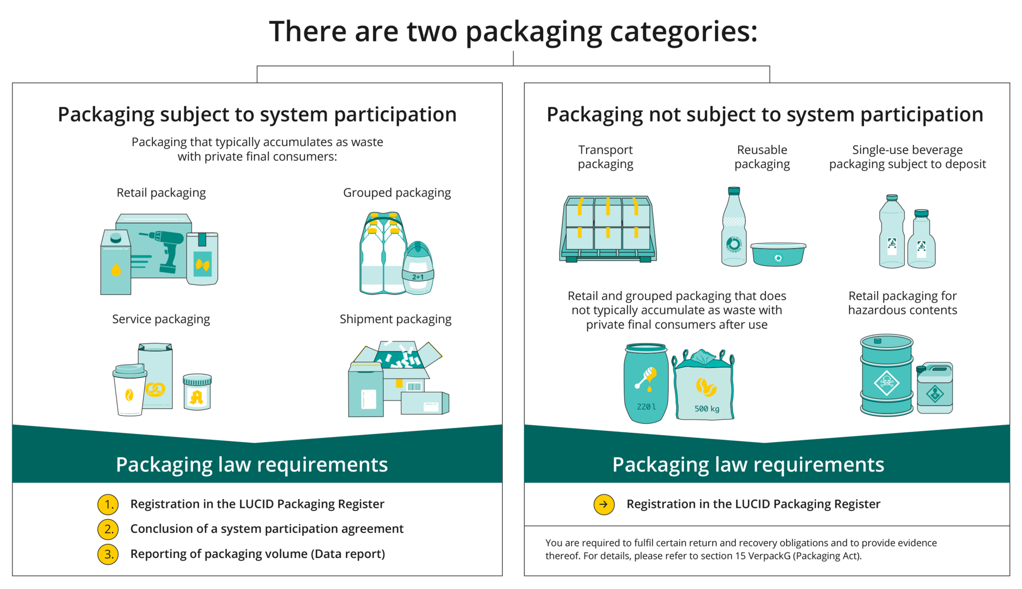 Heads-up: If you are manufacturing, packaging and distributing your products yourself or if you are importing goods into Germany and are legally responsible for those goods at the time they cross the border, you are responsible for your retail packaging. If your review shows that the packaging is subject to system participation, you have three obligations to fulfil: registration, participation, reporting.