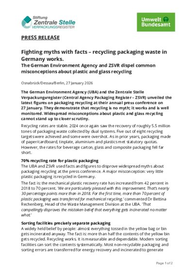 The Zentrale Stelle Verpackungsregister (Central Agency Packaging Register – ZSVR) hosts an annual press conference to share new data, recycling rates and developments in packaging recycling. You can download the presentations and accompanying press releases here.